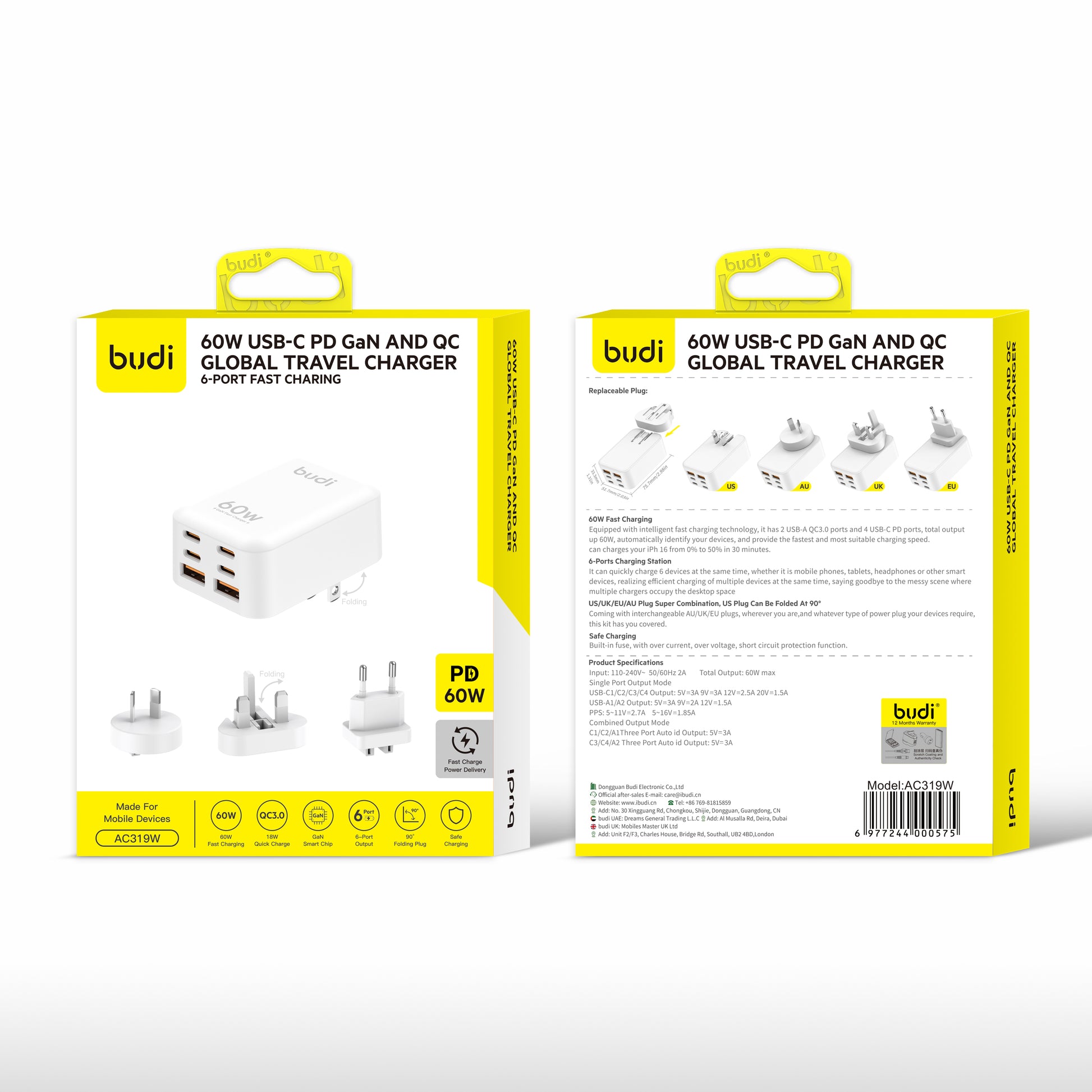 60W USB-C PD GaN & QC Global Travel Charger 6-Port Fast Charging Adapter