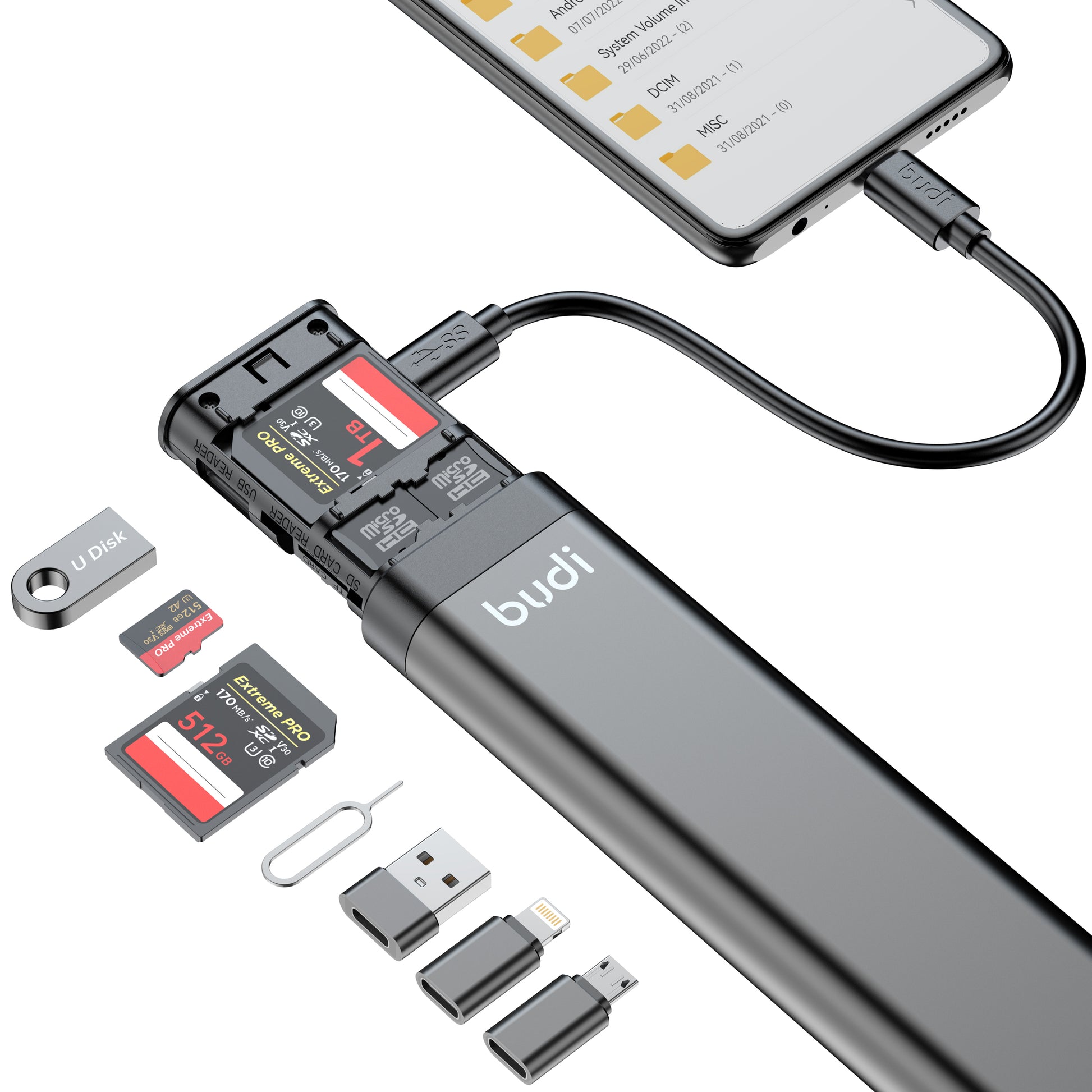 Supports multiple functions including USB flash drive access, microSD card reading, and data transfer between devices. -